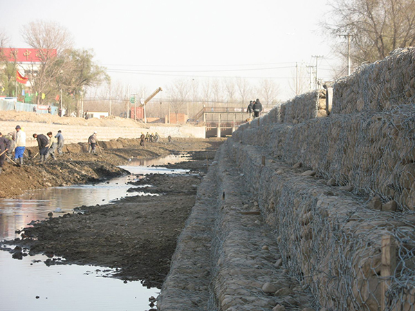綁好后,用機器小心將塞克格賓一個一個或兩個兩個的吊放到恰當(dāng)位置。為了保證質(zhì)量,石籠網(wǎng)縫邊、組裝時應(yīng)用較粗的邊絲和綁絲。
