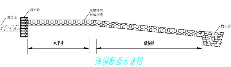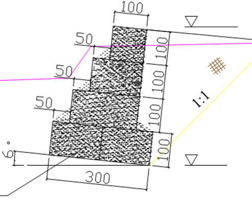 護(hù)坡結(jié)構(gòu)包括枯水位以下部位的護(hù)腳和枯水位以上部位的護(hù)坡兩部分。網(wǎng)墊厚度根據(jù)水流速度確定,以達(dá)到最優(yōu)安全性和經(jīng)濟(jì)性,一般采用厚度為0.17m-0.3m的網(wǎng)墊。坡比一般1:1.5-3,可根據(jù)土的內(nèi)摩擦系數(shù)和土與網(wǎng)墊的摩擦系數(shù)確定。