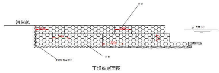 丁壩又稱(chēng)挑水壩,是廣泛使用的河道整治和維護(hù)建筑物,其主要功能為保護(hù)河巖不受來(lái)流直接沖蝕而產(chǎn)生掏刷破壞,同時(shí)它也在改善航道、維護(hù)河相以及保全水生生息場(chǎng)多樣化方面發(fā)揮著作用。生態(tài)格網(wǎng)因其內(nèi)部石塊的天然孔隙,本身是透水結(jié)構(gòu),具有良好的抗沖刷和力學(xué)效應(yīng),但同時(shí)它也能保灘促淤,水中泥沙也能很好的沉積,攔住垃圾等,具有明顯的生態(tài)效果。