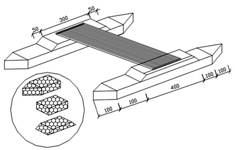 在某些山區(qū)河道,水位落差大。在雨水旺季水流湍急,有時(shí)有暴雨沖刷,常常破壞原有橋梁。再加上山區(qū)電力和機(jī)械的供應(yīng)不足,也會(huì)給施工帶來(lái)一些限制。生態(tài)格網(wǎng)結(jié)構(gòu)具有很好的抗沖刷性,施工也很便捷,因此采用該工藝。